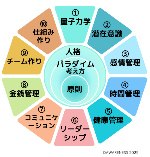 ▼10個の目標達成能力(基礎能力)①量子力学②潜在意識③感情管理④時間管理⑤健康管理⑥リーダーシップ⑦コミュニケーション⑧金銭管理⑨チーム作り⑩仕組み作り